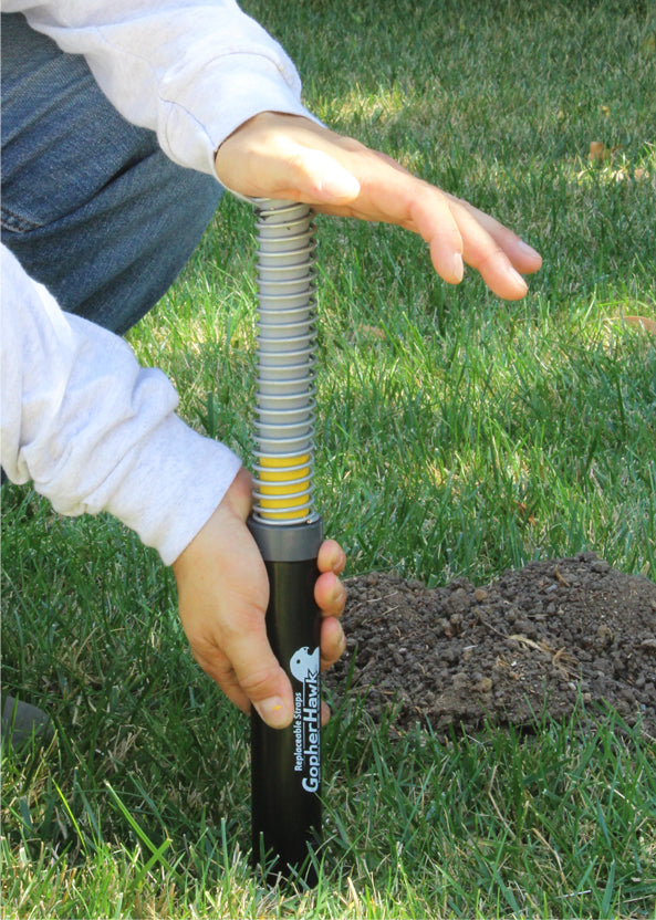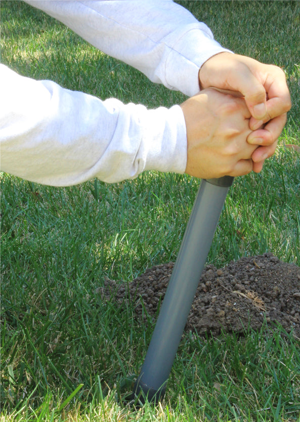 Looking for a fresh mound, use the probe to search an area 6-10 inches around the mound to locate an active tunnel. The tunnel is found when the Probe pushes through the soil more easily, with less resistance. Next use the wedge to enlarge the probe's hole.
