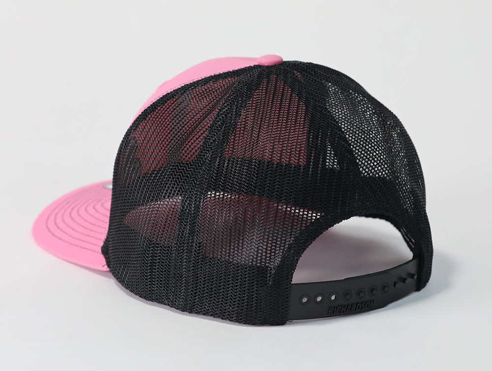 Hot-pink embroidered front with black mesh back. Brand: Richardson